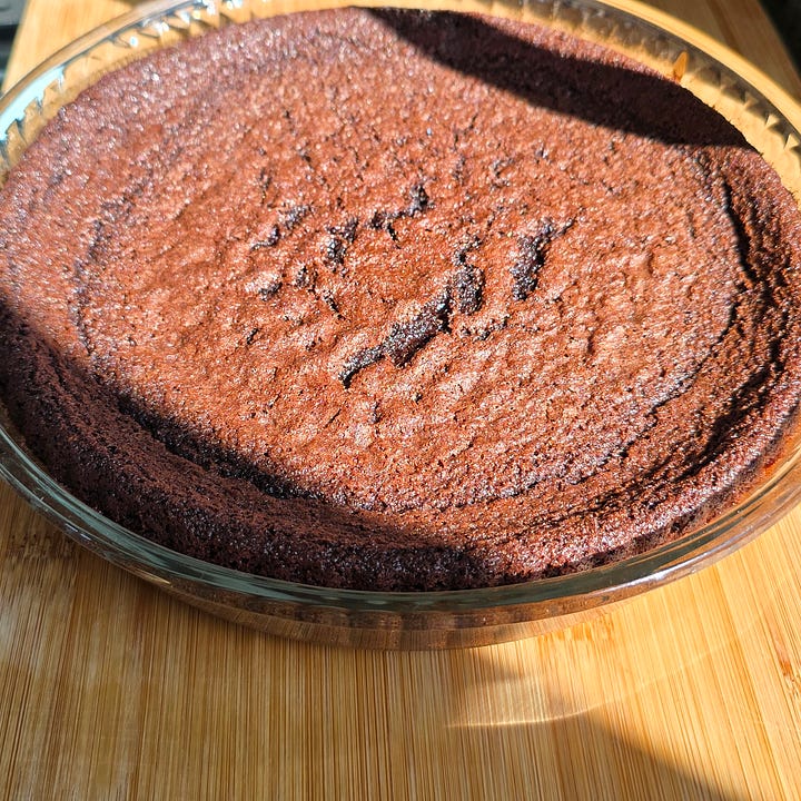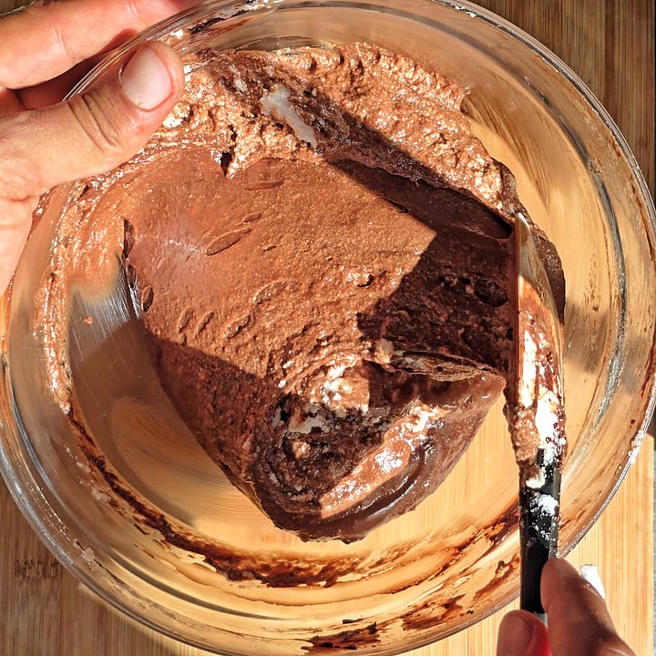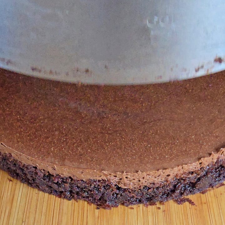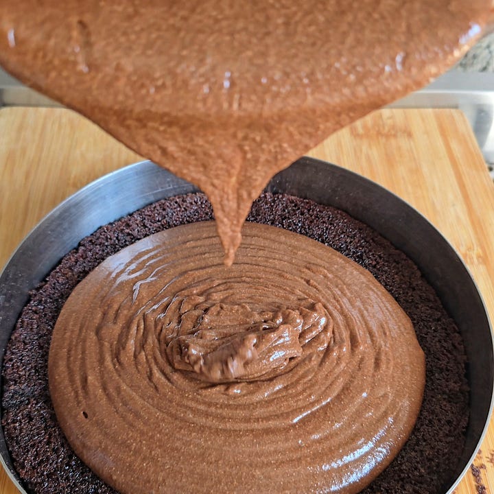 Aujourd’hui, on oublie tout. On lâche les chevaux. Allons-y fort. Pas de tarte sage, pas de biscuit discret, mais un gâteau qui envoie du lourd sans l’être : une base moelleuse au chocolat surmontée d’une mousse aérienne, assemblé comme un entremets. Un gâteau fou, riche et généreux, exactement ce qu’il me fallait pour retrouver ma place derrière les fourneaux.