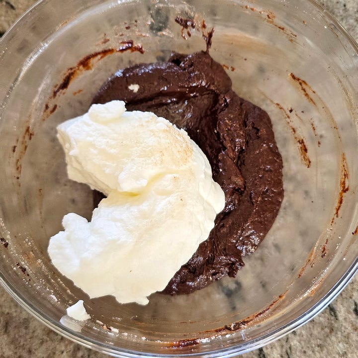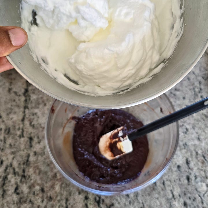 Fold one-third of the egg whites into the chocolate mixture to loosen it, then gently fold in the rest. If using whipped cream, fold it in last, carefully.