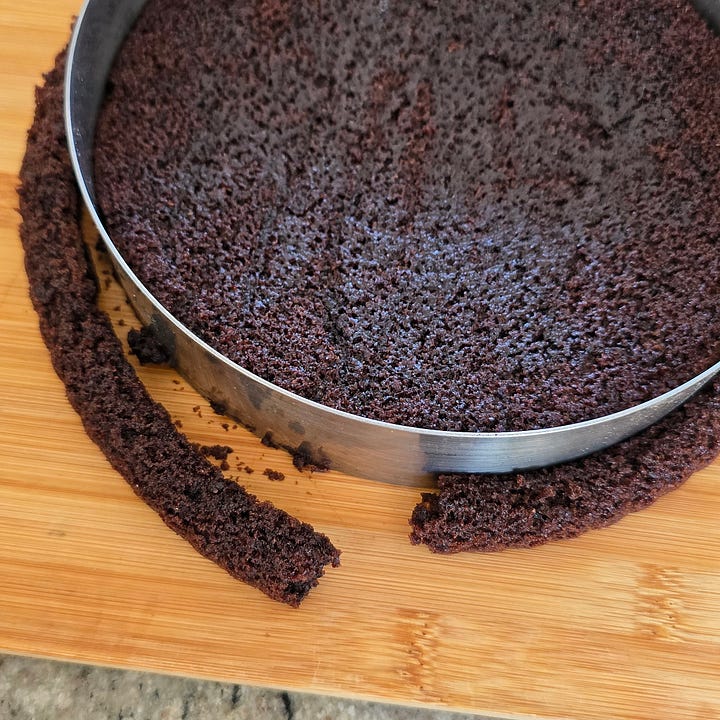 Place a cake ring (20–22 cm / 8–9 inch) on a serving plate. Trim the cooled cake with the ring for neat edges and place it at the bottom.