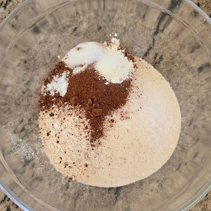 In a large bowl, sift together flour, sugar, cocoa powder, baking powder, baking soda, salt, and espresso powder. Mix well.
